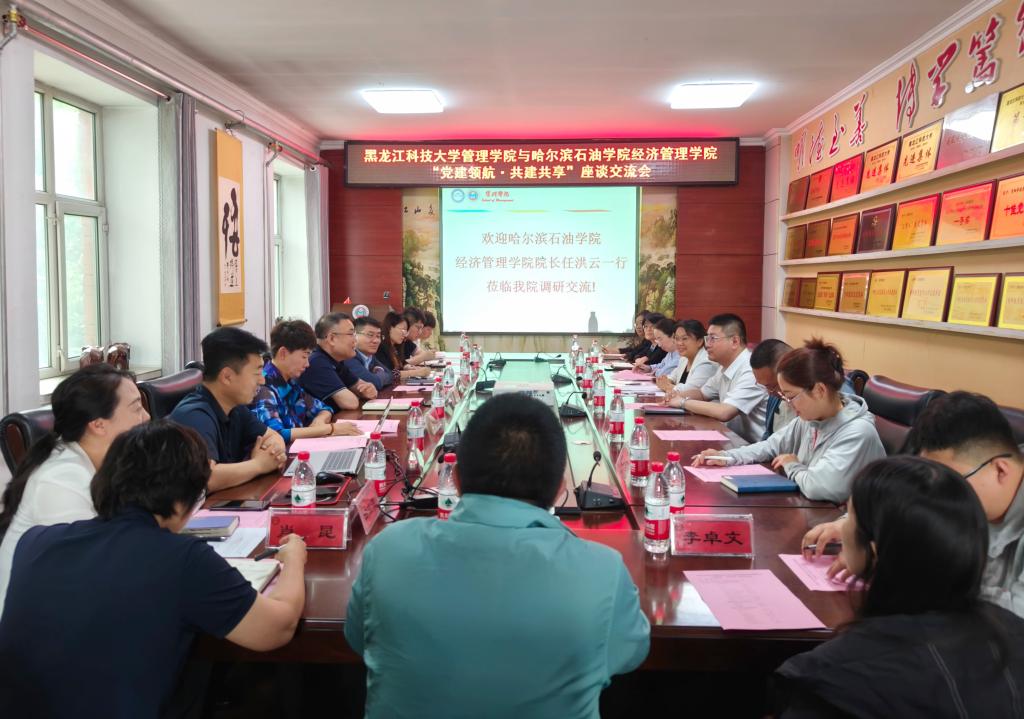 6月6日下午,哈尔滨石油公司经济beats365亚洲版官网党总支书记宋旭、经理任洪云等一行10人来我校公司开展“党建领航·共建共享”座谈交流。公司党委书记何景洋、经理洪亮、党委副书记徐海英、科研副经理张倩、教学副经理高太光、教务科科长肖昆、市场营销系主任田雪莲参加座谈会。 “东北亚跨境电商产业公司”共建单位——黑龙江俄速通集智科技有限公司副总经理都宪宇、项目经理姜松岩应邀出席座谈会。